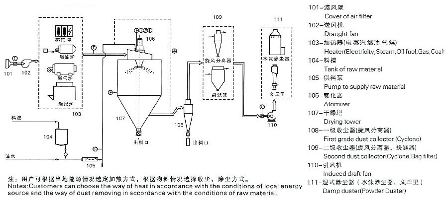 Air that has been filtered and heated enters the air distributor at the top of the dryer, then descends uniformly in a spiral within the drying chamber. Liquid is dispersed into extremely fine droplets by the high-speed rotation of the atomizer at the top of the tower, and subsequently comes into contact with hot air, being dried into finished product in an extremely short time. The finished product is continuously discharged from the bottom of the drying tower or by a cyclone separator, while exhaust gas is expelled by an exhaust fan.
