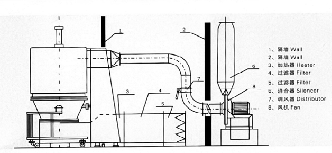 After being heated and purified, the air is introduced from the bottom by the induced draft fan and passes through the mesh plate of the hopper. In the studio, fluidization is formed through stirring and negative pressure, and the water evaporates rapidly and is carried away by the exhaust, resulting in rapid drying of the material.