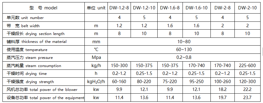 注:1. 单层带式干燥机一般结合某种物料的特殊性而专业设计。2. 其技术参数参照上述参数表推导得出。