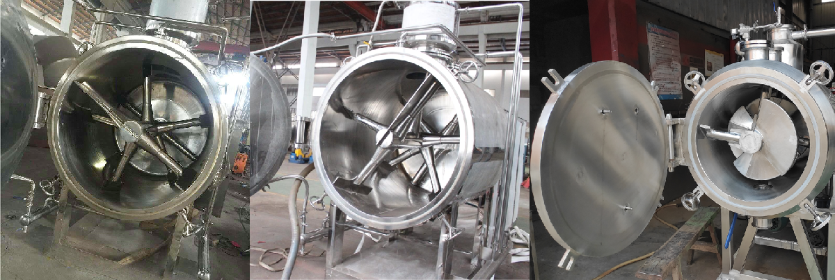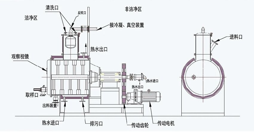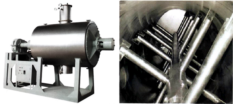 This machine is a novel horizontal intermittent vacuum drying equipment. Wet materials are evaporated through conduction, and a scraper stirrer is equipped to continuously remove the materials on the hot surface and move them inside the container to form a circulating flow. After the water evaporates, it is pumped out by a vacuum pump.