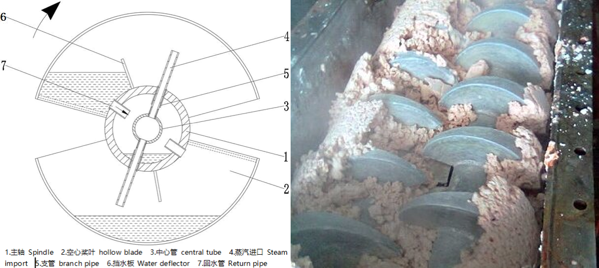 The heating medium flows simultaneously through the jacketed annular space of the cylinder and the hollow paddle on the shaft, increasing the heat transfer area. The internal structure of the hollow agitator shaft varies depending on the type of heat transfer medium to ensure optimal heat transfer efficiency.