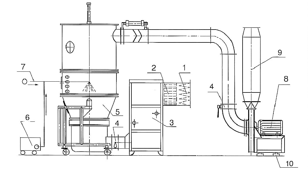1. Medium efficiency filter 2, sub high efficiency filter 3, heater 4, air regulating valve 5, fluidized bed 6, infusion pump 7, compressed air 8, induced draft fan 9, muffler 10, shock absorber