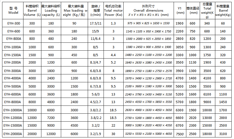 The rotary drum of the EYH two-dimensional mixer can perform two movements simultaneously, one is the rotation of the rotary drum, and the other is the swing of the rotary drum with the swing frame. The mixed material rotates, flips, and mixes inside the drum, while also undergoing left and right back and forth mixing movements with the swinging of the drum. Under the combined action of these two movements, the material is fully mixed in a short period of time. The EYH two-dimensional mixer is suitable for mixing all powder and granular materials.