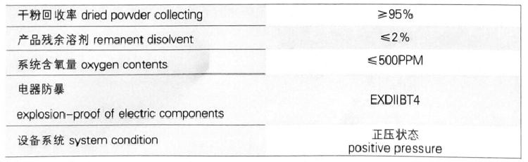 The closed-circuit spray drying system mainly consists of a centrifugal spray dryer host, a gas filter, a heater, a blower, a first-level cyclone separator, a second-level cyclone separator, a condenser, a water and gas separator, an exhaust fan, a feed pump, an oxygen meter, as well as pipelines and control valve groups.