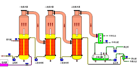 2. The energy-saving effect is good, saving about 70% of steam than a single-effect evaporator. Materials are evaporated and concentrated in a closed system, and the environment is clean. The system is designed with a defoaming device to prevent material liquid loss.